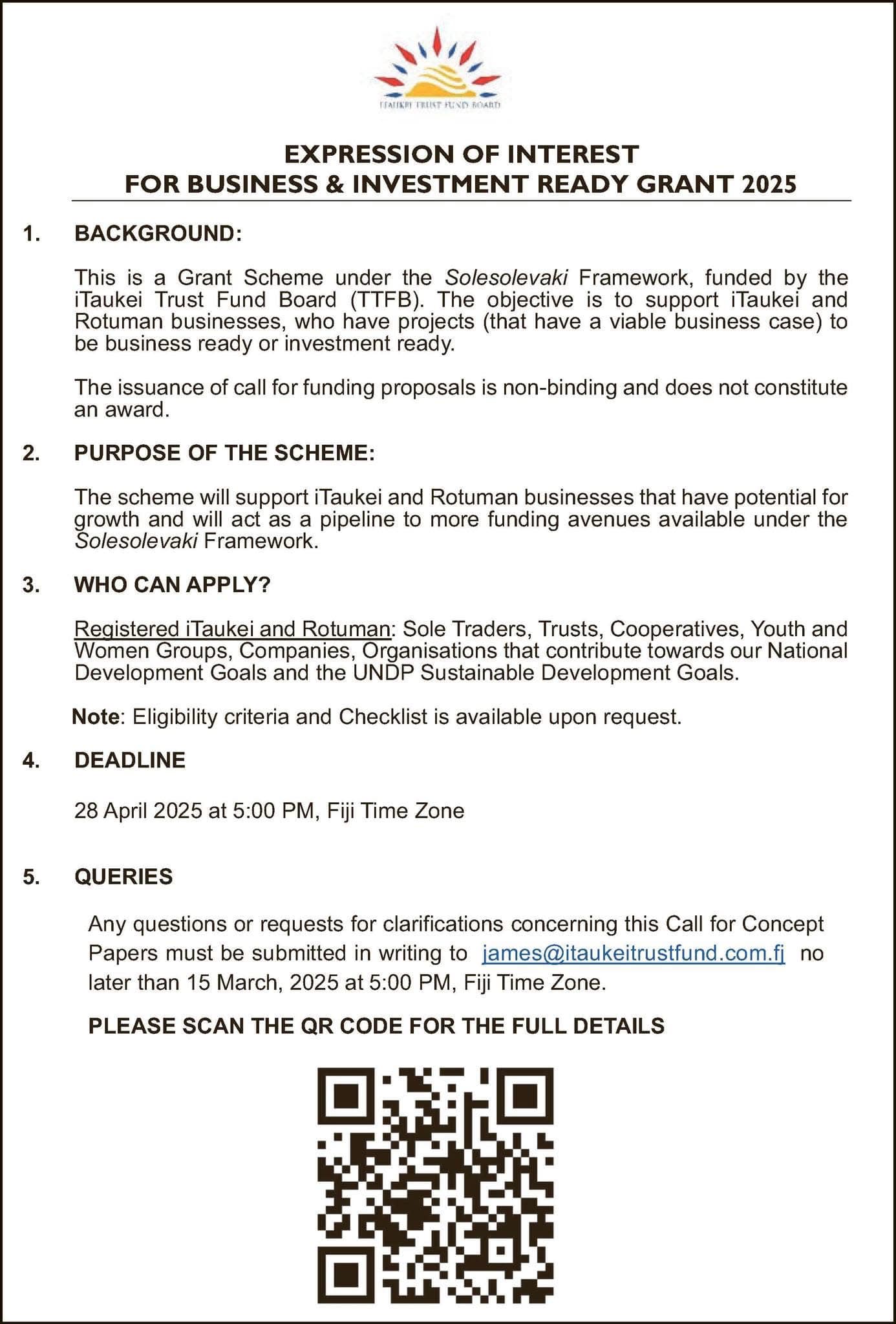 This is a Grant Scheme under the Solesolevaki Framework, funded by the iTaukei Trust Fund Board (TTFB). The objective is to support iTaukei and Rotuman businesses, who have projects (that have a viable business case) to be business ready or investment ready. The issuance of call for funding proposals is non-binding and does not constitute an award.